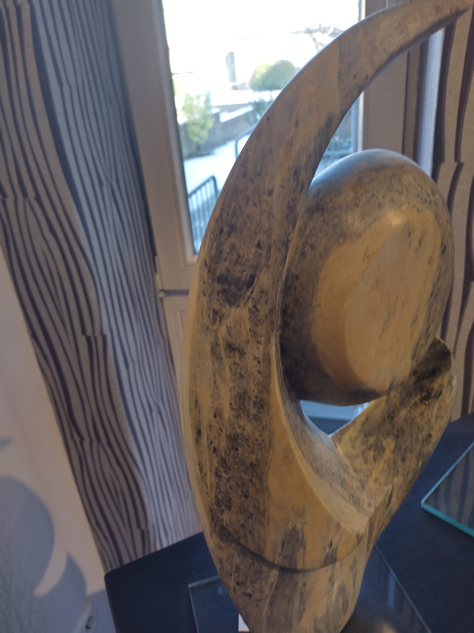The bright face stands out from the raised hands in marbled colors (soapstone)