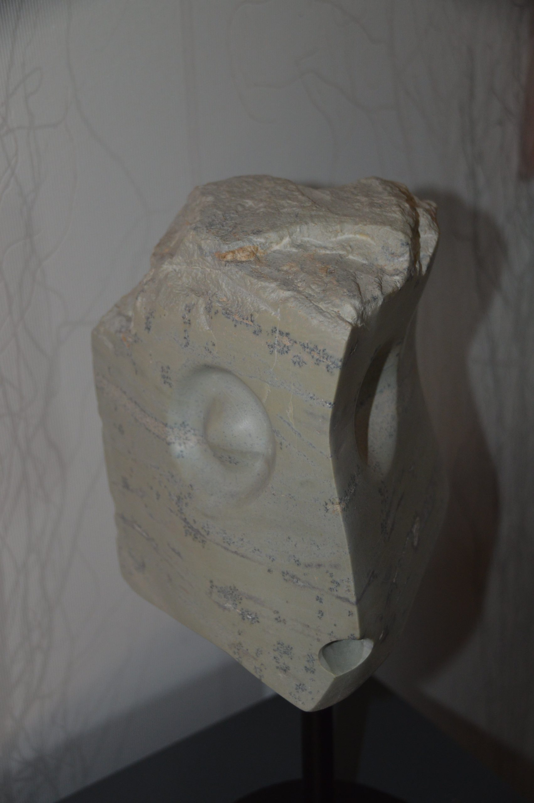 Face made of monocrome soapstone with two differently shaped eyes