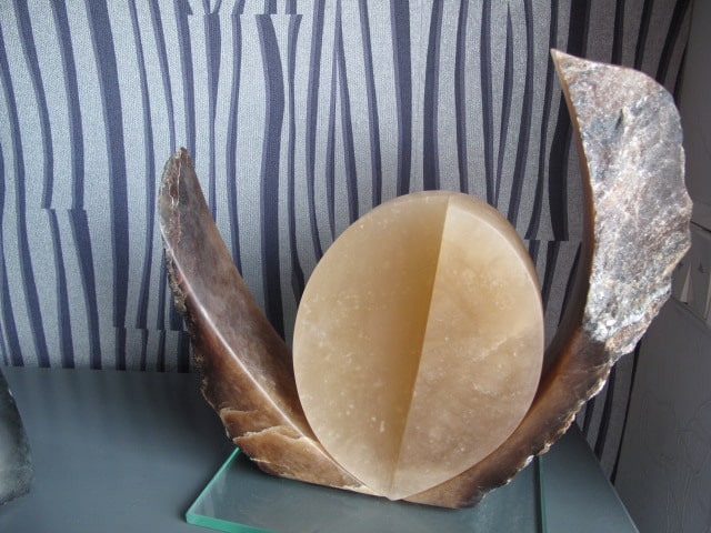 The figure consists of 3 parts of alabaster; the darker part is alabaster with oxidized iron Key Features: Suitable only for indoor environments.